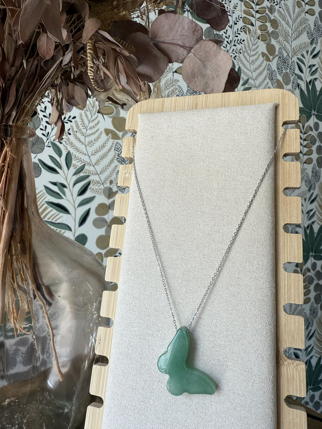 Collier Pendentif Papillon en Aventurine Verte sur Chaine inox couleur argentée