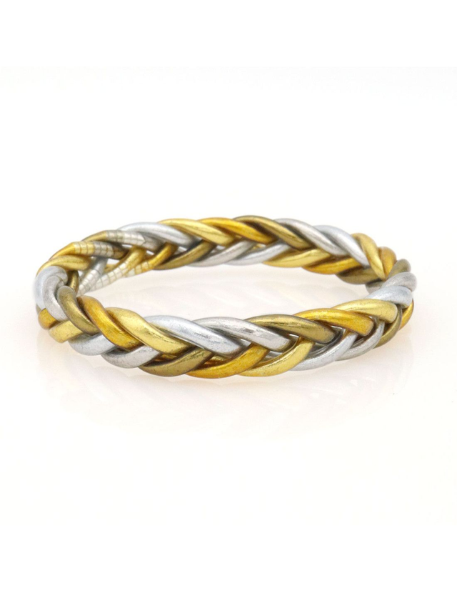 Le jonc tressé est composé de 5 joncs fins tressés entre eux : bronze, doré antique, doré clair, argenté, argenté foncé.