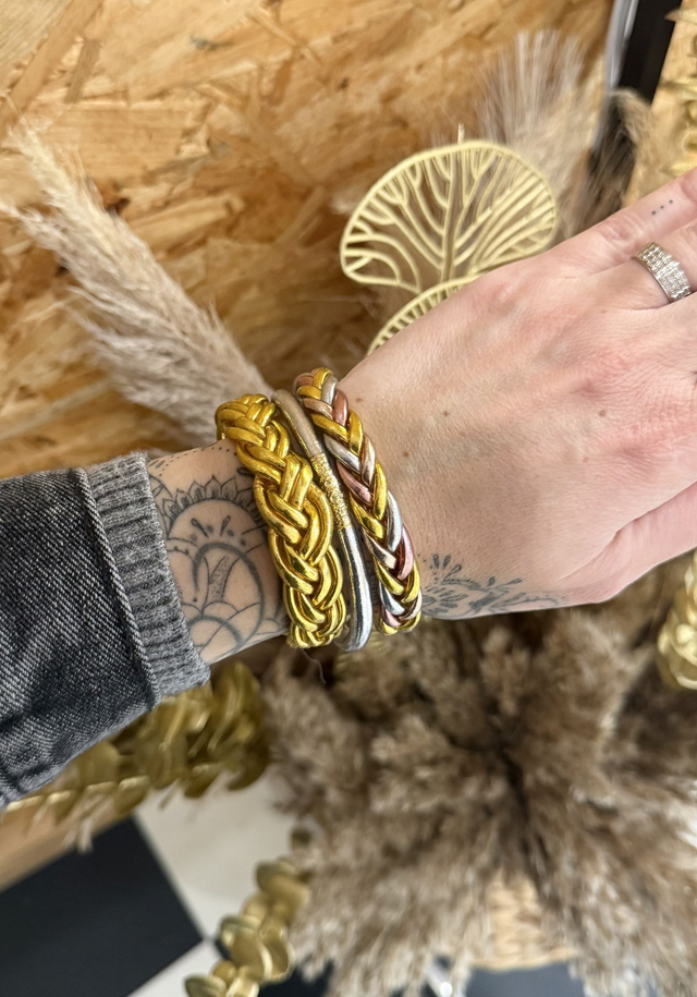 CE LOT COMPREND UN JONC TRESSÉ MULTICOLORE + UN JONC DOUBLE TRESSE DORÉ + UN JONC SIMPLE ARGENTÉ MANTRA DORÉ